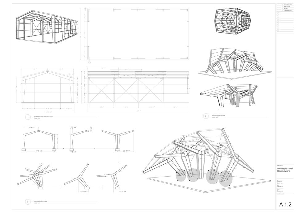In this project I use the existing utilitarian framework of a butler building and modify it to into a contemporary, aesthetic, and functional community space. The process involved studying the various elements that are part of the butler building system and then creating a new set of rules to twist, pull, and modify the elements. No alterations are made to the structurally fixed elements of the system in order to save on cost. The result is a new "kit of parts" that becomes contextually relevant.
